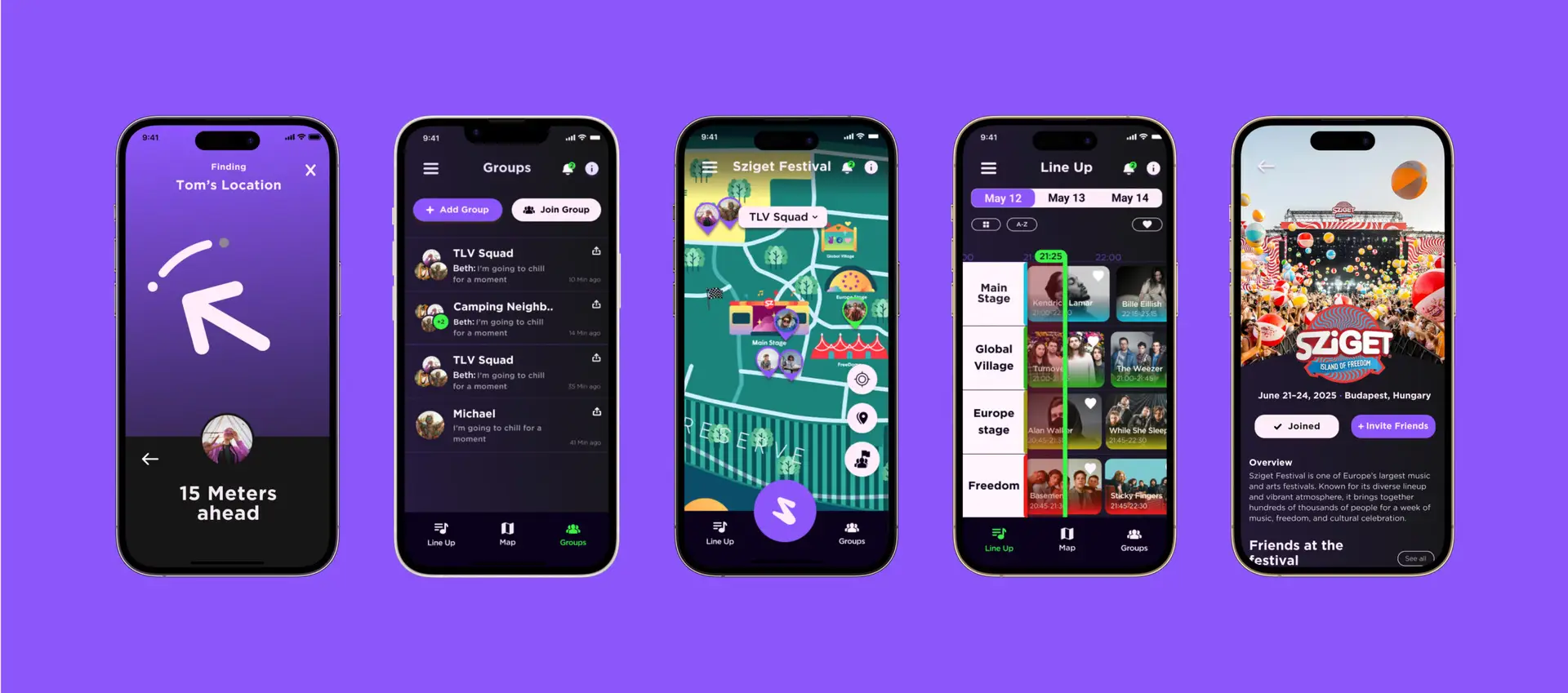 Since traditional navigation methods like standard maps aren’t effective in such environments, I had to explore alternative, intuitive solutions for real-time friend tracking. Another key challenge was designing a brand and app interface that is not only clear and functional, but also keeps users in the vibrant, energetic vibe of a festival. The design needed to remain visually accessible under changing light conditions, and be easy to use in crowded areas of the events.