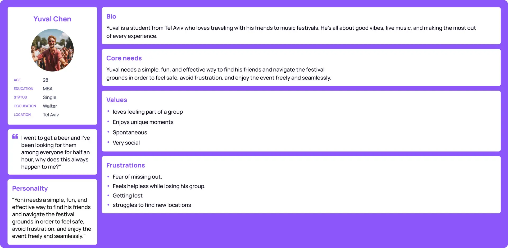 As part of my user research, I created a persona, looked into similar apps , built a user journey, and talked to people who go to festivals. I also did some field research in crowded places to understand how people move around and connect in busy environments.